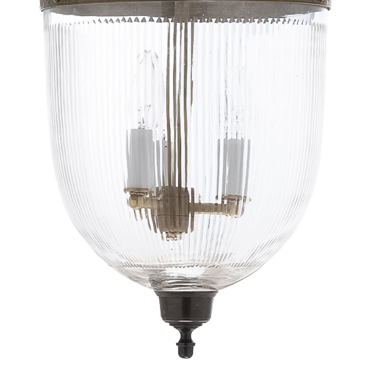 Introducing a magnificent and dazzling play of light and shadow with the CDNY LG. PRISMATIC LANTERN. This impressive ceiling-mounted chandelier combines classic design with a unique and captivating glass texture, making it an ideal choice for grand entryways, expansive dining rooms, or large living areas where an elevated and sparkling aesthetic is desired. The defining feature of this lantern is its generously sized clear glass jar, elegantly detailed with vertical fluted or "prismatic" ribs. This distinct texture beautifully disperses and refracts light, creating a stunning visual effect and adding a captivating sparkle to your ambiance. The rich antique brass finish on the sturdy metal frame, graceful chain, and internal components perfectly complements the glasswork, enhancing its timeless and opulent appeal. The adjustable 3-foot chain allows for versatile installation, ensuring you can achieve the perfect hanging height to complement your interior design. Designed to accommodate four candle-style bulbs (60 watts each, bulbs not included), this fixture provides abundant and brilliant illumination, transforming your room into an inviting space filled with classic grandeur and sparkling light. Its commanding size and secure ceiling-mounted design ensure it stands as a distinguished and elegant focal point. Bring the radiant beauty and enduring sophistication of this CDNY masterpiece into your cherished home.