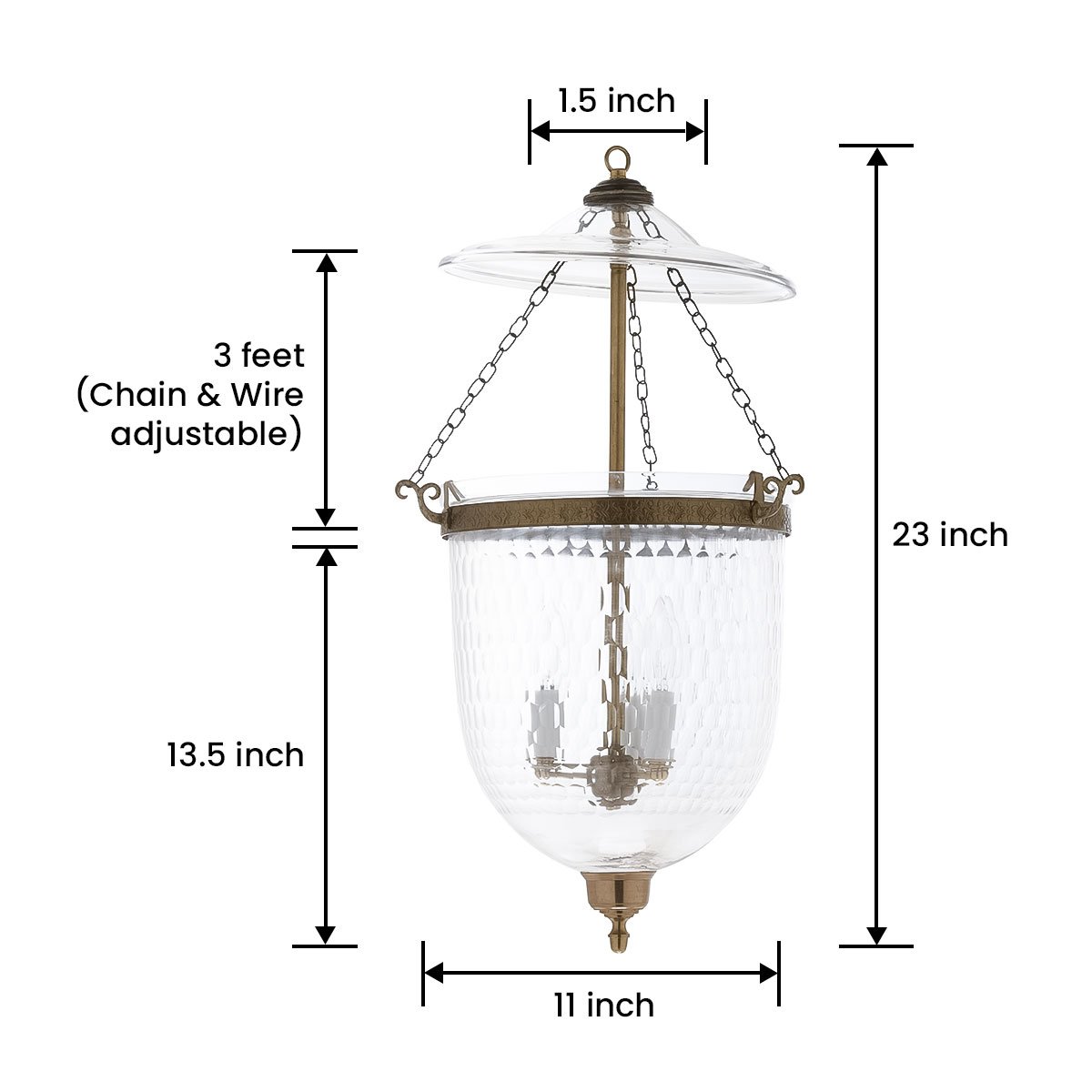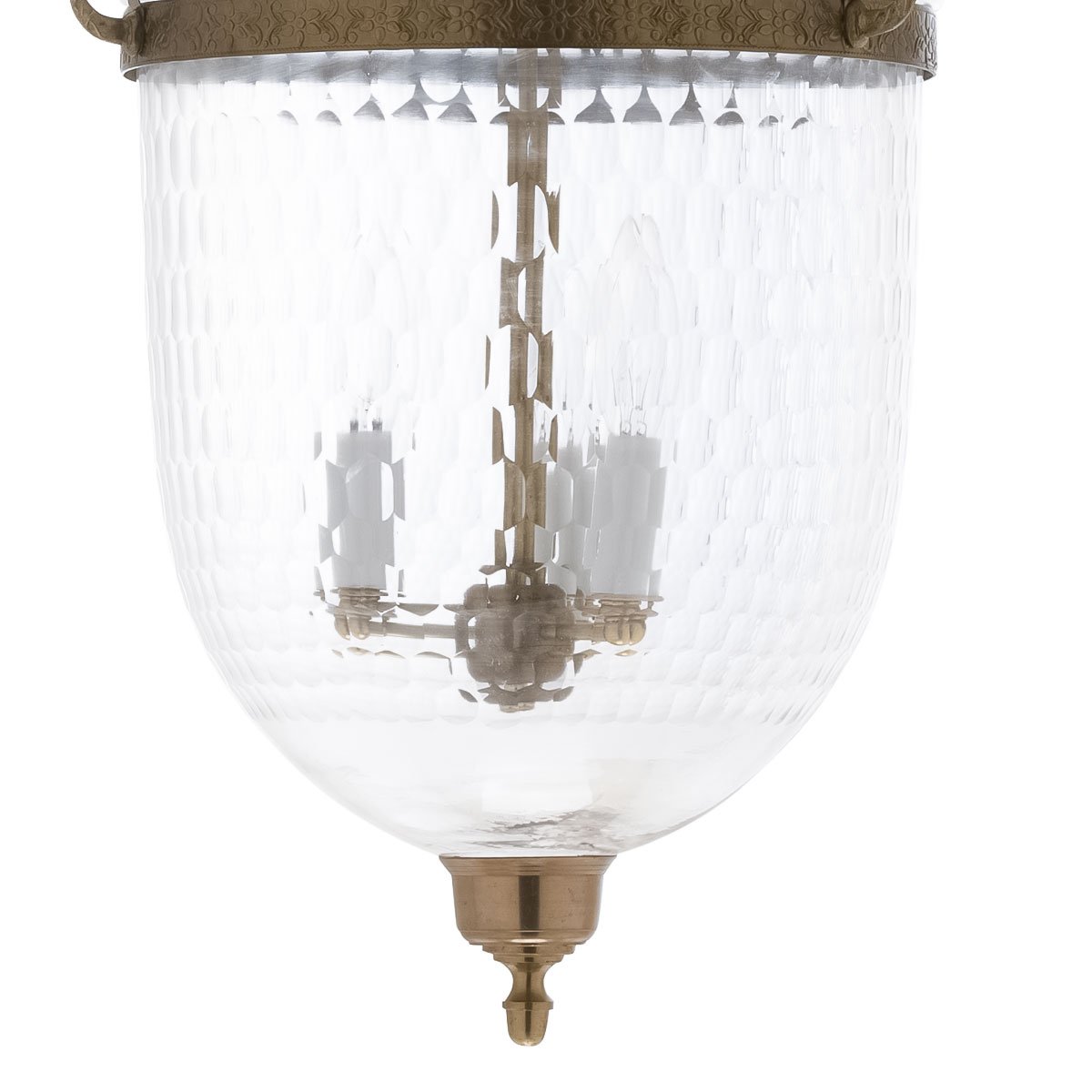 Introduce unique texture and warm illumination to your grand spaces with the CDNY LG. THUMBPRINT LANTERN. This impressive ceiling-mounted chandelier boasts a distinctive "thumbprint" patterned glass, making it a captivating focal point for expansive entryways, dining rooms, or living areas where you desire both sophisticated design and inviting light. The defining characteristic of this lantern is its generously sized clear glass jar, beautifully adorned with a raised "thumbprint" or dimpled texture. This unique pattern not only adds rich visual and tactile interest but also beautifully interacts with light, creating a subtle prismatic effect and enhancing the ambiance with a warm, diffused glow. The opulent antique brass finish on the sturdy metal frame, elegant hanging chain, and internal components perfectly complements the glasswork, enhancing its timeless and refined appeal. With an adjustable 3-foot chain, you can effortlessly customize the hanging height to achieve the perfect illumination for your interior. Designed to accommodate three candle-style bulbs (60 watts each, bulbs not included), this fixture provides abundant and consistent lighting, transforming your room into a welcoming sanctuary. Its commanding size and secure ceiling-mounted design ensure it stands as a distinguished and elegant addition to traditional, transitional, or eclectic interiors. Bring the enduring beauty and radiant charm of this CDNY masterpiece into your cherished home.