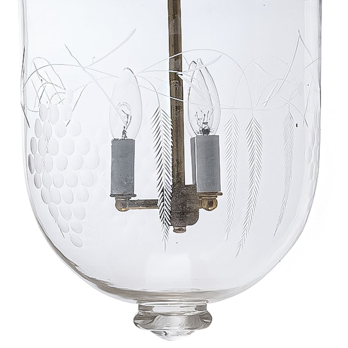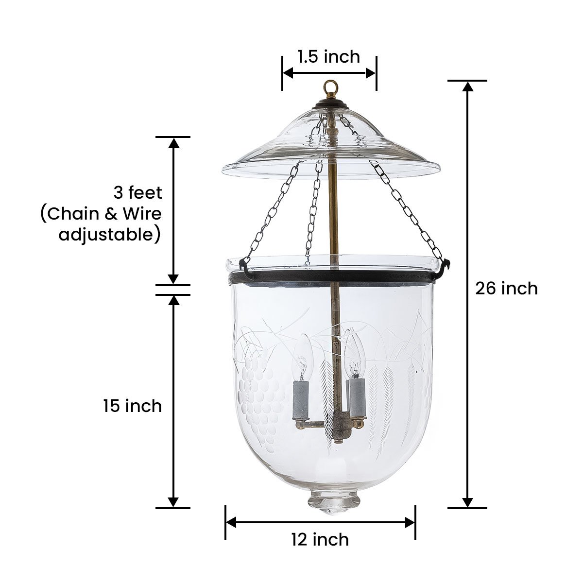 Bring a touch of classic vineyard charm into your home with the CDNY LG. GRAPES LANTERN. This exquisite ceiling-mounted chandelier features a clear glass body beautifully adorned with intricate etched patterns of lush grape clusters and elegant vine leaves, complemented by a timeless Greek key motif around its upper edge. This detailed craftsmanship creates a sophisticated and inviting illumination. The transparent etched glass allows light to diffuse gracefully, casting a warm and welcoming glow that enhances the ambiance of any room. Its classic design is further elevated by a rich antique brass finish on the sturdy frame, decorative hanging chains, and internal components, providing an air of traditional luxury. Designed to accommodate four candle-style bulbs (not included), this fixture provides ample and consistent lighting, making it ideal for brightening entryways, dining areas, or hallways. The adjustable 3-foot chain and wire length offer excellent versatility, allowing you to customize the hanging height to suit your space and design preferences perfectly. Elevate your home's aesthetic with the radiant character and natural beauty of this CDNY masterpiece.