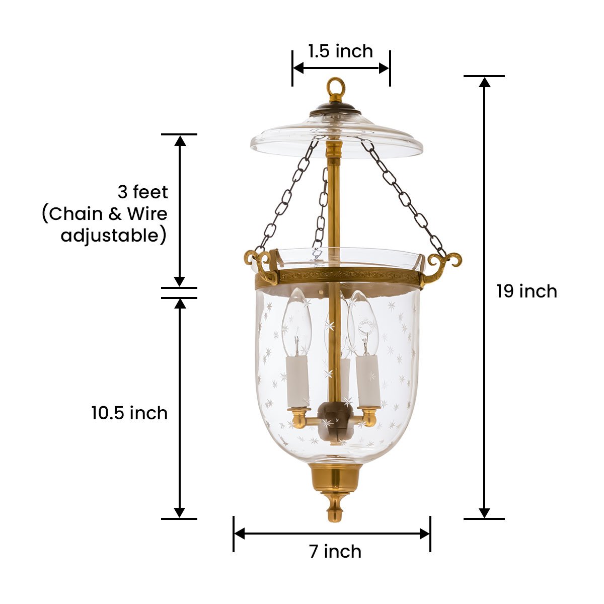 Discover the enchanting glow of the CDNY SM. MINISTARCUT LANTERN, a sophisticated ceiling-mounted chandelier designed to infuse your space with timeless charm. Perfect for entryways, dining areas, or high-ceiling living rooms, this lantern provides both brilliant illumination and exquisite decorative appeal. This lantern boasts a stunning clear glass jar adorned with a captivating "mini star cut" etched pattern. This intricate detailing beautifully disperses light, creating a shimmering effect and adding a layer of refined texture to your decor. The glass is perfectly complemented by a rich antique brass finish on the sturdy metal frame, elegant chain, and internal components, enhancing its classic allure. The adjustable 3-foot chain ensures versatile installation, allowing you to achieve the ideal hanging height for your aesthetic needs. Equipped to accommodate three candle-style bulbs (60 watts each, bulbs not included), this fixture provides ample, warm lighting that transforms your room into a haven of classic elegance. Its substantial size and secure ceiling-mounted design make it a prominent and graceful addition to traditional, transitional, or even eclectic interior themes. Elevate your home's ambiance with the radiant beauty and enduring style of this CDNY masterpiece.