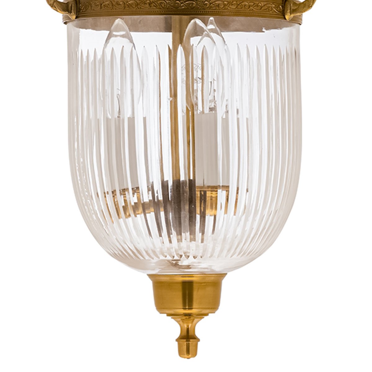 Introduce a sophisticated play of light and shadow with the CDNY SM. PRISMATIC LANTERN. This exquisite ceiling-mounted chandelier combines classic design with a unique glass texture, making it an ideal choice for grand entryways, dining rooms, or living spaces where an elevated aesthetic is desired. The defining feature of this lantern is its clear glass jar, elegantly detailed with vertical fluted or "prismatic" ribs. This distinct texture beautifully disperses and refracts light, creating a dazzling effect and adding a captivating visual element to your decor. The rich antique brass finish on the sturdy metal frame, graceful chain, and internal components perfectly complements the glasswork, enhancing its timeless and opulent appeal. The adjustable 3-foot chain allows for versatile installation, ensuring you can achieve the perfect hanging height to complement your interior design. Designed to accommodate three candle-style bulbs (60 watts each, bulbs not included), this fixture provides abundant and warm illumination, transforming your room into an inviting space filled with classic grandeur. Its substantial size and secure ceiling-mounted design ensure it stands as a distinguished and elegant focal point. Bring the radiant beauty and enduring sophistication of this CDNY masterpiece into your cherished home.