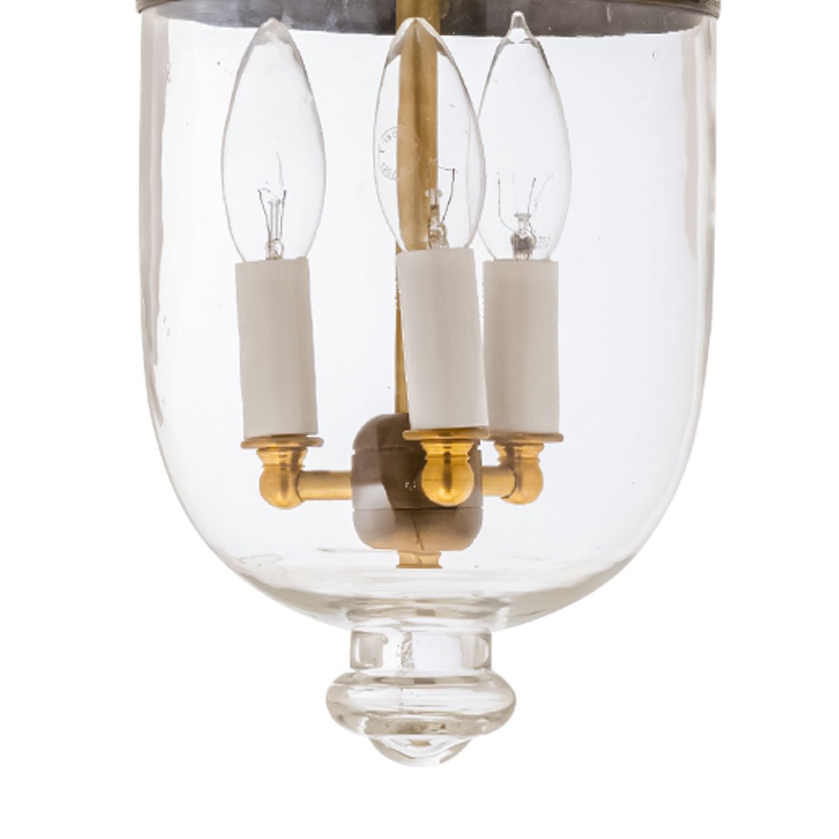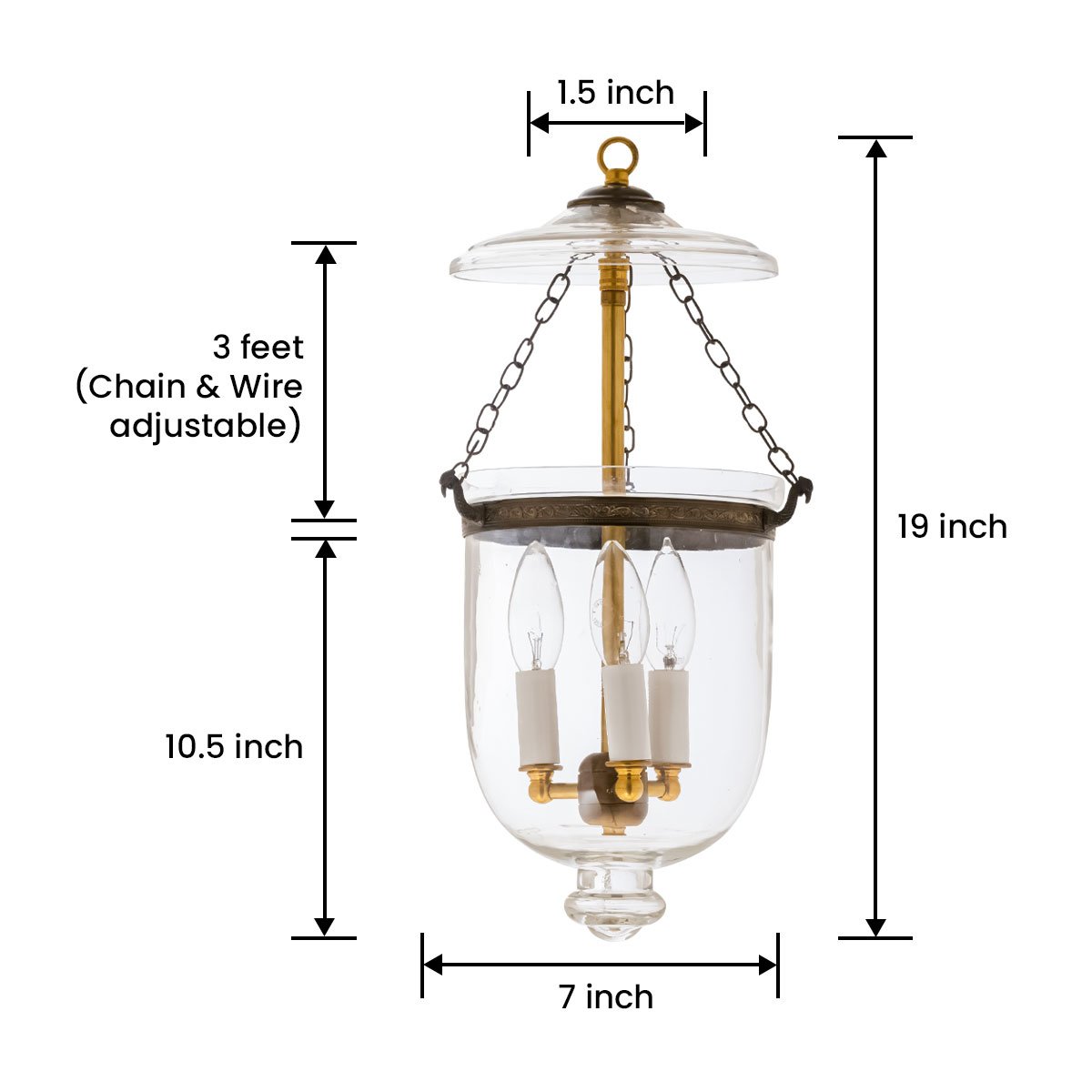 Embrace understated elegance with the CDNY SM. PLAIN CLEAR LANTERN. This refined ceiling-mounted chandelier offers a timeless design, making it an exquisite choice for entryways, dining rooms, or living spaces that call for clear, unobstructed illumination and classic appeal. The hallmark of this lantern is its pristine, smooth clear glass jar, allowing the beauty of the internal elements and the warmth of the light to shine through without any patterns or textures. This simplicity creates a sophisticated and versatile aesthetic that complements various decor styles. The luxurious antique brass finish on the sturdy metal frame, graceful chain, and internal components adds a touch of classic opulence, perfectly framing the clear glass. With an adjustable 3-foot chain, you can easily customize the hanging height to create the ideal lighting fixture for your interior. Designed to house three candle-style bulbs (60 watts each, bulbs not included), this fixture provides ample and consistent lighting, ensuring a bright and inviting atmosphere. Its substantial size and secure ceiling-mounted design make it a distinguished yet harmonious addition to traditional, transitional, contemporary, or minimalist interiors. Bring the enduring beauty and radiant clarity of this CDNY masterpiece into your cherished home.