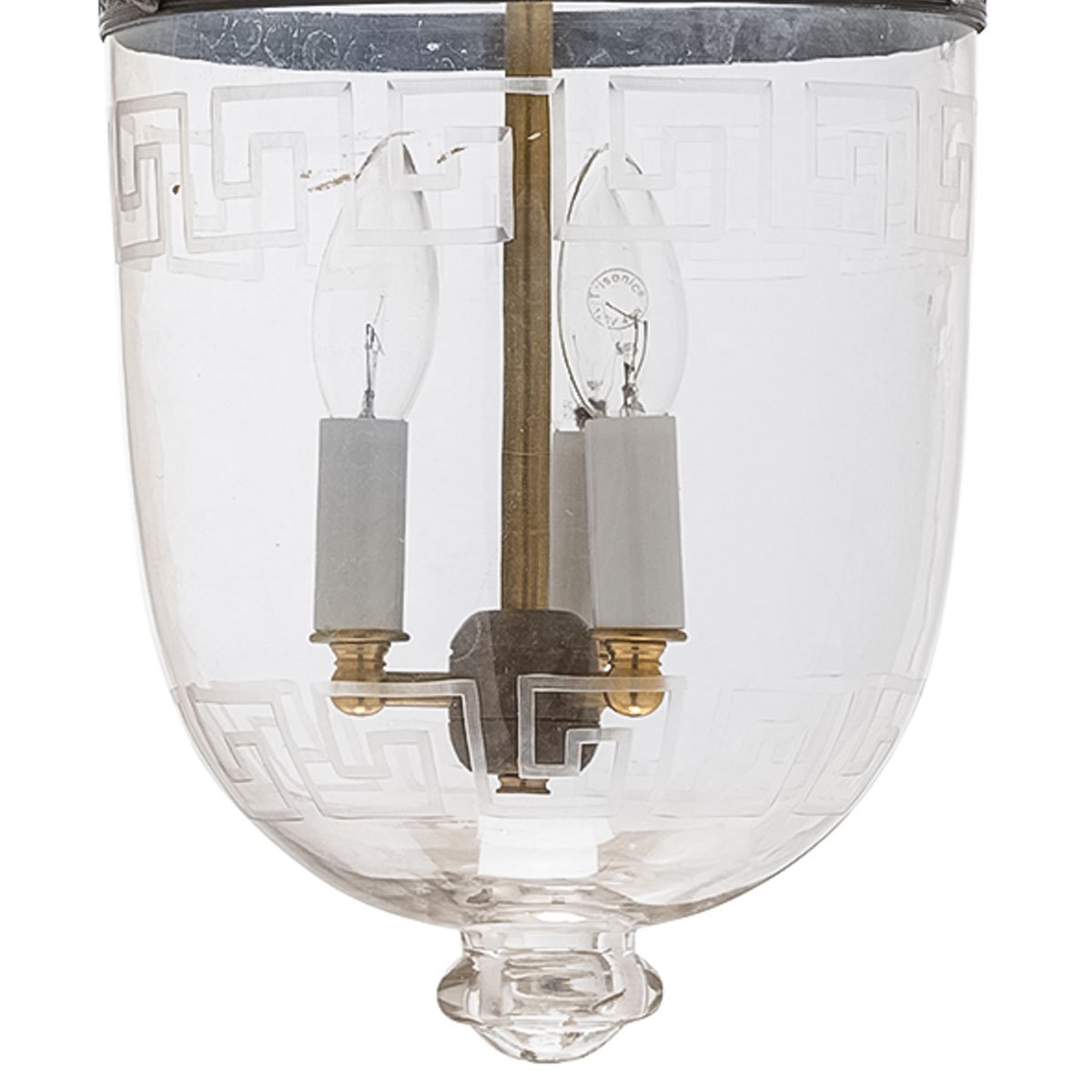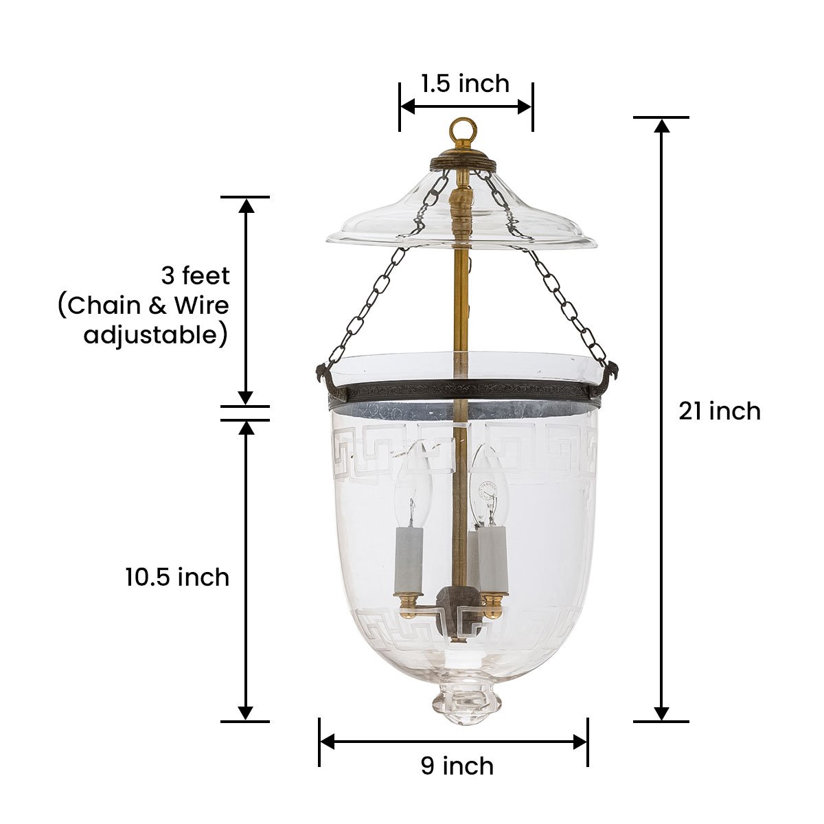 Adorn your grand spaces with the timeless sophistication of the CDNY MED. PLAIN GREEK KEY LANTERN. This exquisite ceiling-mounted chandelier combines classic design with a refined etched detail, making it an ideal choice for larger entryways, dining rooms, or living areas that seek both elegant illumination and a touch of architectural heritage. The defining feature of this lantern is its generously sized clear glass jar, accented with a distinguished "Greek Key" or "Greek Fret" etched band along its upper rim. This subtle yet impactful detailing adds a layer of classical elegance and visual interest while allowing ample light to pass through, creating a brilliant and inviting ambiance. The luxurious antique brass finish on the sturdy metal frame, elegant chain, and internal components perfectly complements the glasswork, enhancing its vintage and cultured appeal. With an adjustable 3-foot chain, you can effortlessly customize the hanging height to create the ideal lighting fixture for your interior. Designed to accommodate three candle-style bulbs (60 watts each, bulbs not included), this fixture provides abundant and consistent lighting, transforming your room into a beacon of classical grandeur. Its commanding size and secure ceiling-mounted design make it a prominent and elegant addition to traditional, neoclassical, or transitional interiors. Bring the enduring beauty and sophisticated patterns of this CDNY masterpiece into your cherished home.