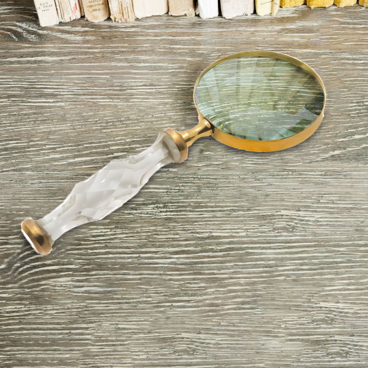 The CDNY Crystal-Clear Magnifying Glass is a masterpiece of elegance and functionality. Its stunning faceted handle, crafted from a transparent, crystal-cut acrylic, brilliantly reflects light and provides a secure, comfortable grip. The polished brass frame holds a high-quality 4-inch glass lens, offering a powerful 5X magnification that brings clarity to everything from fine print to intricate details on maps or collectibles. This magnifying glass serves as both a practical tool and a luxurious decorative item, making it a sophisticated addition to any desk, library, or home.